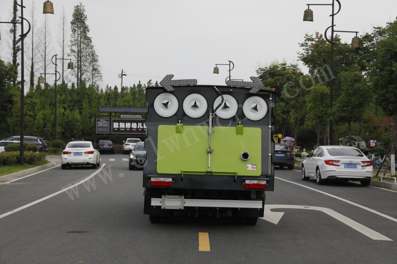 中置吸盤、施耐德**開關、江鈴副發動機、海普瑞斯電磁閥組、無級變速自動離合器、免維護離心式風機、高精度垃圾箱過濾系統(**高可達0.3微米)、進口脈沖閥、尾部LED箭頭燈、手動泵應急系統;車尾霧狀噴水潤濕功能