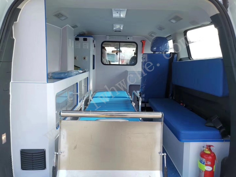 前頂裝全藍**燈**報器(100W)1套;折疊式擔架1件;醫藥柜1件;固定安裝10L氧氣瓶1只;輸液吊鉤2只;消毒燈1只;污物桶1只;后艙空調和暖風;中隔斷帶滑窗1套;12V照明燈2個;500W逆變器1只;220V電源插座1組;醫用耐磨塑膠地板;貼救護十字標志;左邊長條椅軟座墊、軟靠背和安全帶1套(或單人座椅2只)