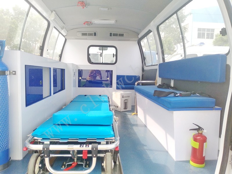 前頂裝全藍**燈**報器(100W)1套;折疊式擔架1件;醫藥柜1件;固定安裝10L氧氣瓶1只;輸液吊鉤2只;消毒燈1只;污物桶1只;后艙空調和暖風;中隔斷帶滑窗1套;12V照明燈2個;500W逆變器1只;220V電源插座1組;醫用耐磨塑膠地板;貼救護十字標志;左邊長條椅軟座墊、軟靠背和安全帶1套(或單人座椅2只)。