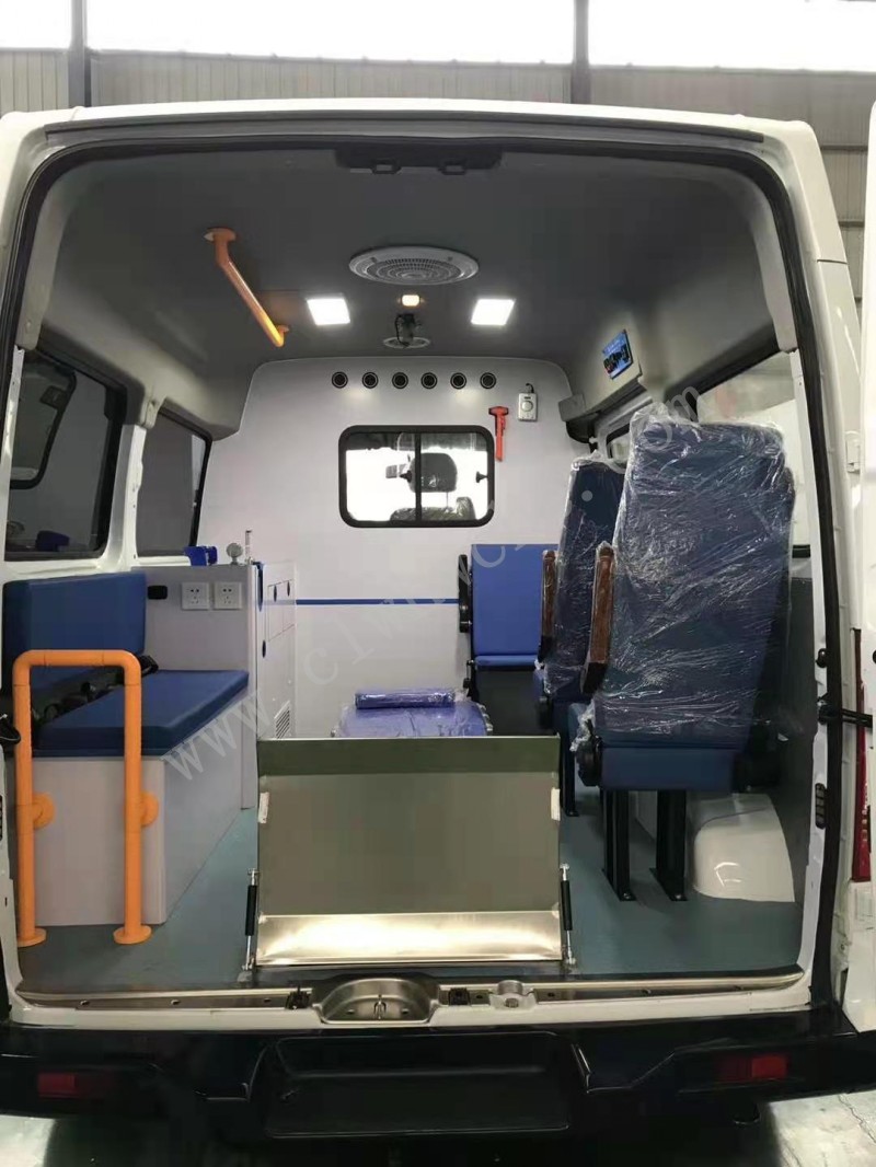 前頂裝全藍**燈**報器(100W)1套;折疊式擔架1件;醫藥柜1件;固定安裝10L氧氣瓶1只;輸液吊鉤2只;消毒燈1只;污物桶1只;后艙空調和暖風;中隔斷帶滑窗1套;12V照明燈2個;500W逆變器1只;220V電源插座1組;醫用耐磨塑膠地板;貼救護十字標志;左邊長條椅軟座墊、軟靠背和安全帶1套(或單人座椅2只)。