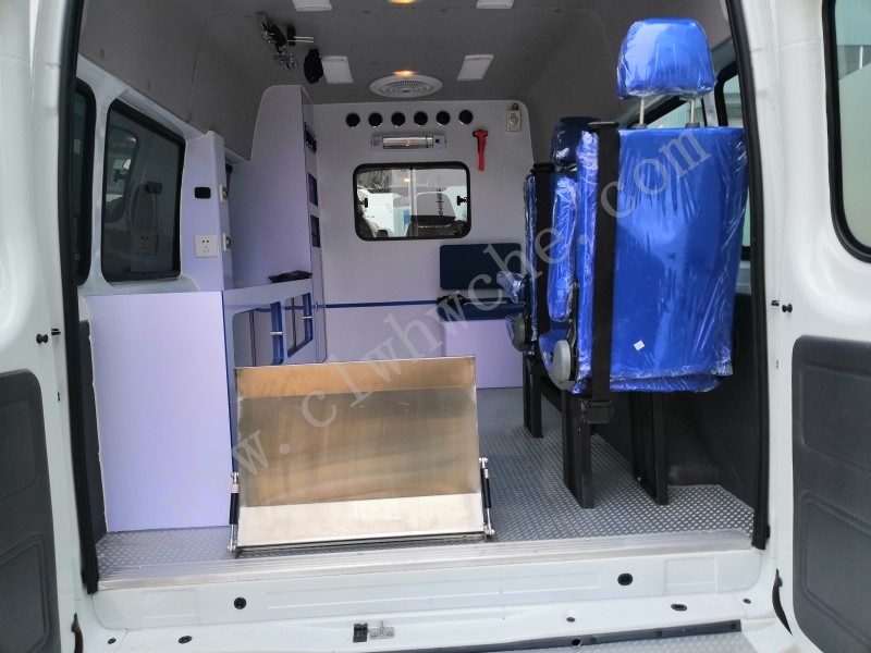 前頂裝全藍**燈**報器(100W)1套;折疊式擔架1件;醫藥柜1件;固定安裝10L氧氣瓶1只;輸液吊鉤2只;消毒燈1只;污物桶1只;后艙空調和暖風;中隔斷帶滑窗1套;12V照明燈2個;500W逆變器1只;220V電源插座1組;醫用耐磨塑膠地板;貼救護十字標志;左邊長條椅軟座墊、軟靠背和安全帶1套(或單人座椅2只)。