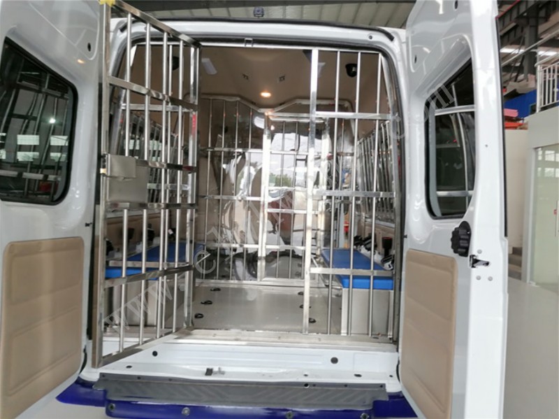 20、中隔柵欄:車內不銹鋼囚籠隔斷,開門,帶門鉸鏈及鎖止插銷。側窗柵欄:不銹鋼囚籠隔離欄。后窗柵欄:不銹鋼囚籠隔離欄。尾隔柵欄:不銹鋼囚籠隔斷,帶門鉸鏈及鎖止插銷。